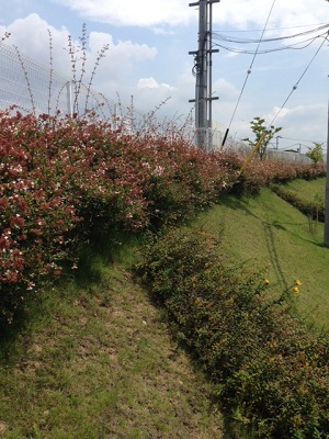 法面の上部に植えてあるアベリアの刈り込みを鈴木スタッフに任せました。