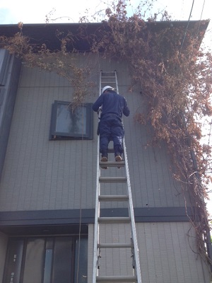ユニック(移動式クレーン車)を持っていない私たちは2連梯子で作業します。